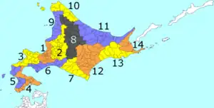 Hokkaidō est la seule à être entièrement subdivisée en quatorze sous-préfectures[1]. Elles sont elles-mêmes divisées en villes ou districts ruraux (qui regroupent villages et bourgs) :