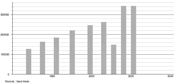 - Population municipale légale en vigueur au 1er janvier 2024, millésimée 2021, définie dans les limites territoriales en vigueur au 1er janvier 2023, date de référence statistique : 1er janvier 2021.
