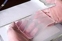 - Une feuille de membrane en nitrocellulose (ou encore en nylon) est placée sur le gel. Une pression est appliquée au gel en plaçant une pile de serviettes de papier et par un poids sur la membrane et le gel, par exemple. Ceci va permettre le déplacement de l'ADN contenu dans le gel sur la membrane par capillarité grâce à une solution saline. L'ADN va se fixer sur la membrane.