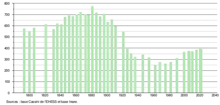 L'évolution du nombre d'habitants est connue à travers les recensements de la population effectués dans la commune depuis 1793. Pour les communes de moins de 10 000 habitants, une enquête de recensement portant sur toute la population est réalisée tous les cinq ans, les populations légales des années intermédiaires étant quant à elles estimées par interpolation ou extrapolation[28]. Pour la commune, le premier recensement exhaustif entrant dans le cadre du nouveau dispositif a été réalisé en 2005[29].