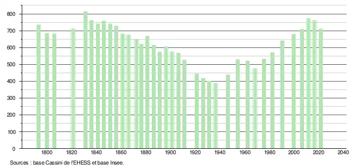 L'évolution du nombre d'habitants est connue à travers les recensements de la population effectués dans la commune depuis 1793. Pour les communes de moins de 10 000 habitants, une enquête de recensement portant sur toute la population est réalisée tous les cinq ans, les populations légales des années intermédiaires étant quant à elles estimées par interpolation ou extrapolation[26]. Pour la commune, le premier recensement exhaustif entrant dans le cadre du nouveau dispositif a été réalisé en 2006[27].