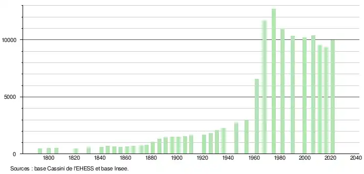 - Par convention dans Wikipédia, et afin de permettre une comparaison correcte entre des recensements espacés d’une période de 5 ans, le principe a été retenu, pour les populations légales postérieures à 1999 de n’afficher dans le tableau des recensements que les populations correspondant aux années 2006, 2011, 2016, etc ainsi que la dernière population légale publiée par l’INSEE. Dans le graphique sont par contre représentés l’ensemble des populations légales connues.