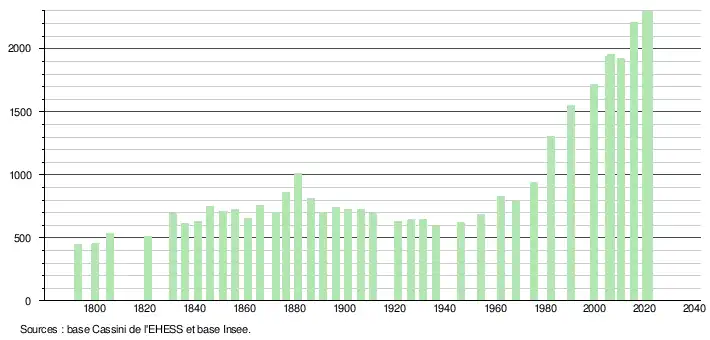 L'évolution du nombre d'habitants est connue à travers les recensements de la population effectués dans la commune depuis 1793. Pour les communes de moins de 10 000 habitants, une enquête de recensement portant sur toute la population est réalisée tous les cinq ans, les populations légales des années intermédiaires étant quant à elles estimées par interpolation ou extrapolation[26]. Pour la commune, le premier recensement exhaustif entrant dans le cadre du nouveau dispositif a été réalisé en 2005[27].
