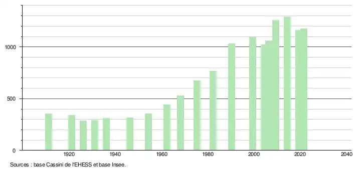 L'évolution du nombre d'habitants est connue à travers les recensements de la population effectués dans la commune depuis 1911. Pour les communes de moins de 10 000 habitants, une enquête de recensement portant sur toute la population est réalisée tous les cinq ans, les populations légales des années intermédiaires étant quant à elles estimées par interpolation ou extrapolation[30]. Pour la commune, le premier recensement exhaustif entrant dans le cadre du nouveau dispositif a été réalisé en 2004[31].