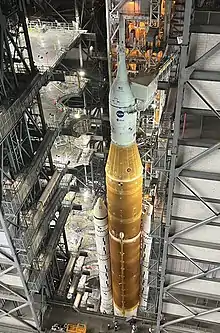 En juillet 2021, l'assemblage du premier exemplaire du lanceur SLS débute dans la baie 3 du bâtiment VAB du centre spatial Kennedy. Le premier étage et les propulseurs d'appoint sont installés sur la plateforme de lancement mobile[40], puis un mois plus tard le deuxième étage ICPS[41]. Débutent alors les tests d'intégration de la fusée qui s'achèvent en septembre. En octobre, le vaisseau Orion est installé au sommet du lanceur et une deuxième séquence de test d'intégration[42] s'achève en mars 2022[43]. La plateforme de lancement mobile supportant la fusée est alors déplacée jusqu'au pas de tir 39B d'où la mission Artemis I doit être lancée[44]. Débute alors la répétition des opérations de lancement. Durant ces tests qui comprennent le remplissage des réservoirs de la fusée et la simulation d'un compte à rebours, plusieurs anomalies sont mises en évidence dont notamment une fuite dans une des conduites alimentant les réservoirs ainsi qu'une valve bloquée. La correction de ces problèmes nécessite que le lanceur soit rapatrié dans le VAB, ce qui remet en cause la date du lancement d'Artemis 1 programmé en . Toutefois les réparations sont effectuées rapidement et la fusée est de retour sur le pas de tir début . Une répétition du lancement est menée presque jusqu'à son terme le avec quelques anomalies mineures. Le lanceur doit réintégrer le VAB pour la correction des dernières anomalies constatées et la préparation du lancement qui pourrait intervenir à compter de fin août[45].
