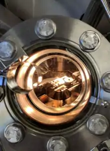 La chambre d’ultravide est la chambre où sera déposé l’échantillon afin d’être irradié. Elle sert aussi à pouvoir faire l’ultravide. L’environnement dans la chambre de radiation doit être exempt de champ magnétique externe[8].