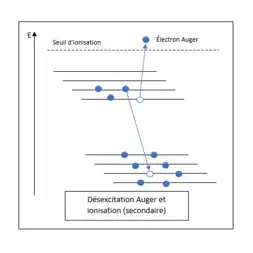 Les rayons X excitent un atome, en haut du seuil d'ionisation, de la surface d'un solide et un électron de cœur est émis. Alors, le système est excité, mais il se désexcite lorsqu'un électron des couches externes va prendre la place de l'électron ayant été émis. Ceci provoque un dégagement d'énergie qui peut conduire à l'émission d'un photon et il y aura de la fluorescence. Le photon émis n'est pas observé au XPS. L'énergie dégagée peut aussi être absorbée par un autre électron et celui-ci aura suffisamment d'énergie pour être éjecté. Cet électron éjecté se nomme électron Auger. Ils sont visibles sur les spectres de XPS, mais ils forment des pics distincts de ceux formés par les électrons de cœur[2].