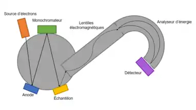 Également connu sous le nom d’analyseur de secteur hémisphérique (HSA), cet analyseur de déflection, soit qu’il dévie le faisceau d’électrons à l’aide d’un champ magnétique[17] ou il agit à titre de filtre en ne laissant passer que les électrons autour d’une certaine énergie cinétique donnée, appelée « énergie de passage ». Cette instrumentation est conçue pour avoir une résolution en énergie, c’est-à-dire la précision avec laquelle est mesurée l’énergie d’une raie dans un spectre, constante et aussi élevée que possible.Celui-ci consiste en deux hémisphères cylindriques de rayons différents dans lesquelles passe une différence de potentiel constante[8]. Cette différence de potentiel permettra aux électrons, précédemment ralentis par les lentilles électromagnétiques, dont l’énergie cinétique correspond à l’énergie de passage de l’analyseur de se rendre au détecteur afin d’être analysés[10].