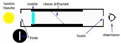 On obtient un spectre grâce à un réseau de diffraction constitué d'une fine plaquette sur laquelle ont été gravées de minuscules fentes parallèles. Lorsque la lumière incidente vient frapper cette plaquette, elle est diffractée. On observe également un « arc-en-ciel. » Le réseau de diffraction est placé à l'intérieur d'un tube faisant diaphragme. À une extrémité se trouve l'oculaire par laquelle l'observateur regarde le spectre ; à l'autre extrémité, une fente.
