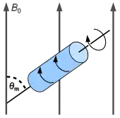 Dans les années 1960, Andrew[4] a montré cependant qu'il était possible d'obtenir des spectres correspondant à la moyenne isotrope des interactions en faisant tourner l'échantillon autour d'un axe incliné de arccos(1/3) ≈ 54° 44' par rapport au champ magnétique. Cet angle est appelé, l’angle magique, et la technique de rotation à l'angle magique est en général désignée par son acronyme anglais : MAS (pour magic angle spinning)