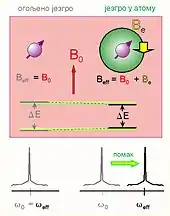 La façon dont la fréquence de résonance de chaque noyau est affectée par ces champs locaux est caractérisée par une constante d'écran, , qui contient les contributions dia- et paramagnétiques :
