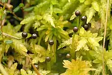 Le sporophyte est une petite capsule rouge à brun-noir portée sur un pseudopode d'origine gamétophytique. La capsule est obturée par un opercule déhiscent. Quand la capsule arrive à maturité, elle se déshydrate et, de sphérique, elle devient cylindrique. La pression interne de l'air peut monter jusqu'à 5 bars[réf. souhaitée]. La capsule expulse alors, avec une vitesse d'éjection comprise entre 10 et 30 m/s, 20 000 à 250 000 spores qui parviennent à atteindre plus de 10 centimètres[10] au-dessus du sol car elles s'organisent en un anneau tourbillonnaire. Cet anneau est déjà connu dans le déplacement des méduses et des calmars, mais c'est la première fois qu'on le découvre chez des végétaux[11].
