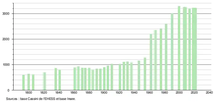 L'évolution du nombre d'habitants est connue à travers les recensements de la population effectués dans la commune depuis 1793. Pour les communes de moins de 10 000 habitants, une enquête de recensement portant sur toute la population est réalisée tous les cinq ans, les populations légales des années intermédiaires étant quant à elles estimées par interpolation ou extrapolation[25]. Pour la commune, le premier recensement exhaustif entrant dans le cadre du nouveau dispositif a été réalisé en 2008[26].