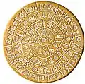 | Bloc d'entrée du tumulus de Newgrange (IIIe millénaire av. J.-C.) | Détail du livre de Durrow | Symboles en spirale du disque de Phaistos (IIe millénaire av. J.-C.) |