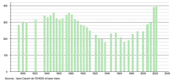 L'évolution du nombre d'habitants est connue à travers les recensements de la population effectués dans la commune depuis 1793. Pour les communes de moins de 10 000 habitants, une enquête de recensement portant sur toute la population est réalisée tous les cinq ans, les populations légales des années intermédiaires étant quant à elles estimées par interpolation ou extrapolation[13]. Pour la commune, le premier recensement exhaustif entrant dans le cadre du nouveau dispositif a été réalisé en 2007[14].