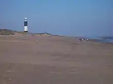 Plage sur la côte maritime du Spurn, avec le phare à l'horizon dans les dunes.