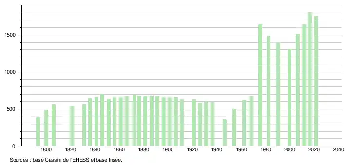 L'évolution du nombre d'habitants est connue à travers les recensements de la population effectués dans la commune depuis 1793. Pour les communes de moins de 10 000 habitants, une enquête de recensement portant sur toute la population est réalisée tous les cinq ans, les populations légales des années intermédiaires étant quant à elles estimées par interpolation ou extrapolation[52]. Pour la commune, le premier recensement exhaustif entrant dans le cadre du nouveau dispositif a été réalisé en 2006[53].