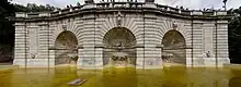 - Fontaine monumentale de Paul Gasq, de style néoclassique (1932) : sous la terrasse supérieure, trois niches en hémicycle et voûtées en cul-de-four abritent une goulotte déversant l'eau dans des vasques ornées de piédouches sculptés de personnages marins (Tritons, naïade), lesquels débordent dans un vaste bassin[1].