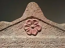 La stèle est surmontée de trois acrotères, un au milieu et un de chaque côté. Son tympan est décoré d'une rosette. L'intérieur des lettres et la rosette étaient peintes rouges[1].