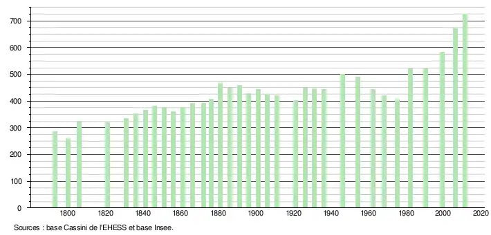 L'évolution du nombre d'habitants est connue à travers les recensements de la population effectués dans la commune depuis 1793. À partir du , les populations légales des communes sont publiées annuellement dans le cadre d'un recensement qui repose désormais sur une collecte d'information annuelle, concernant successivement tous les territoires communaux au cours d'une période de cinq ans. Pour les communes de moins de 10 000 habitants, une enquête de recensement portant sur toute la population est réalisée tous les cinq ans, les populations légales des années intermédiaires étant quant à elles estimées par interpolation ou extrapolation[10]. Pour la commune, le premier recensement exhaustif entrant dans le cadre du nouveau dispositif a été réalisé en 2006[11],[Note 3].