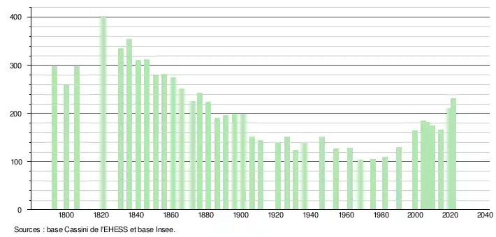 L'évolution du nombre d'habitants est connue à travers les recensements de la population effectués dans la commune depuis 1793. Pour les communes de moins de 10 000 habitants, une enquête de recensement portant sur toute la population est réalisée tous les cinq ans, les populations légales des années intermédiaires étant quant à elles estimées par interpolation ou extrapolation[20]. Pour la commune, le premier recensement exhaustif entrant dans le cadre du nouveau dispositif a été réalisé en 2004[21].