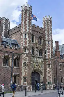 - On entre dans la première cour par la Grande Porte donnant sur St John's Street. Son architecture est très variée. Elle a été construite entre 1511 et 1520 à partir de l'ancien hôpital. Bien qu'elle ait progressivement été modifiée, la partie est a gardé l'apparence qu'elle avait lors de son érection au XVIe siècle[6]. La façade sud a été refaite en 1772-76 dans un style géorgien par l'architecte local James Essex. Celui-ci voulait ainsi moderniser l'entièreté de la cour dans le même style mais le projet a été abandonné. Les plus importantes modifications à la construction Tudor d'origine sont les aménagements victoriens des années 1860 qui ont abouti à la destruction de la chapelle médiévale et à la construction de nouveaux bâtiments plus larges. La nouvelle chapelle édifiée par l'architecte George Gilbert Scott intègre à l'intérieur certains éléments de l'ancienne construction. C'est le plus haut édifice de Cambridge. Une partie de cette première cour a été utilisée comme prison en 1643 lors de la Première Révolution anglaise. Lors de la visite d'Élisabeth II, en , un nouvel accès à la première cour, passant près des ruines de l'ancienne chapelle, a été inauguré par la reine.