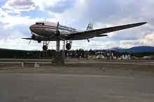 - La stabilité en lacet est la capacité de l'avion à conserver sa direction (son cap) malgré les perturbations. Cette stabilité est obtenue en dotant l'avion d'une dérive (empennage vertical) de surface suffisante : placé en travers par une perturbation, l'avion fera alors face au vent sous l'effet de la portance (latérale) de la dérive, ce qui le ramènera au neutre. Finalement, lors de ce retour au neutre, l'avion se comporte comme une girouette en tournant autour de son centre des masses, ce qui est mis en application en vrai grandeur avec le DC3 ci-contre.