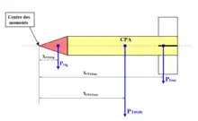 Ainsi, pour une ogive de 155 mm de longueur et une hauteur totale de la fusée de 490 mm, le CPA total de la fusée se place à 365,3 mm de la pointe de l'ogive.