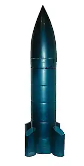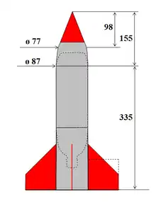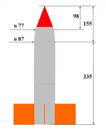 Comme le montre l'image ci-contre, cette ogive est biconique, sa partie blanche (un cône de papier enroulé) se raccordant avec une partie tronconique.