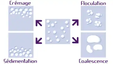 - Sédimentation, quand la phase dispersée est plus dense que la phase continue, celle-ci migre vers le bas (par exemple : encre, suspensions, peinture, etc.).