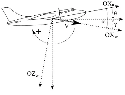 Supposons que par suite d'une rafale ou d'une action sur la profondeur que l'avion ne soit plus en équilibre des moments. L'avion étant stable il y aura un moment de rappel vers l'incidence d'équilibre correspondant à la position de la profondeur. Ce moment sera proportionnel à la "stabilité" mesuré par et par l'écart à l'incidence d'équilibre. Ce moment de rappel va vouloir mettre l'avion en tangage. Pour comprendre comment va réagir l'avion dans le cas où le pilote n'agit plus sur la profondeur (manche bloqué) il est nécessaire d'introduire d'autres angles que l'incidence. Ils sont illustrés sur la figure 5.