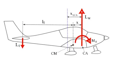 Pour que l'avion garde son attitude (son orientation dans l'espace) la somme des moments des forces aérodynamiques et du poids par rapport au centre de masse CM doit être nulle. L'avion est dit équilibré. Le moment du poids est nul, le centre de masse et le centre de gravité étant confondus. Mettons de côté le moment que peuvent exercer la traînée des ailes et du fuselage et l'action du moteur. Le moment de l'empennage est celui de sa portance qui s'exerce au foyer de l'empennage, distant de du CM. Il sera à piquer si l'empennage est portant. L'empennage en général symétrique n'a pas de moment de portance nulle. Le moment de l'aile est la somme de celui de sa portance s'exerçant à son foyer CA distant de du centre de masse et du moment de tangage de l'aile soit .