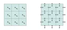 Dans une staggered-grid[3] les variables scalaires (comme la pression) sont stockées aux centre des cellules, tandis que les vélocités sont localisées sur les bords (ou faces) de la cellule.