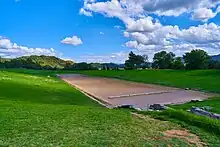La piste du stade d'Olympie accueillait l'épreuve reine des Jeux olympiques, la course à pied appelée stadion. Le public se tenait debout sur les pentes autour de la piste, d'où l'étymologie[note 1].