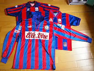 Au gré des saisons, le club reste fidèle au bleu et au rouge, même si les motifs du maillot changent (rayures horizontales lors des premières années professionnelles, scapulaire, barre oblique, parements, etc.). Quelques saisons font exception cependant, au cours des années 1960 ou encore à la fin des années 1970[48], avec un maillot essentiellement blanc.