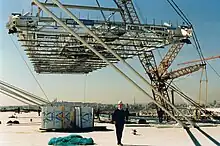 L'une des caractéristiques de ce chantier fut sa rapidité d'exécution. Les 800 000 m2 de terrassement ont été effectués en cinq mois et les 180 000 m3 de béton coulés en un an. Les aménagements techniques, la pose du toit, l'installation de la tribune mobile de 25 000 places se sont également effectués en un an. En outre, 40 000 plans ont été nécessaires.