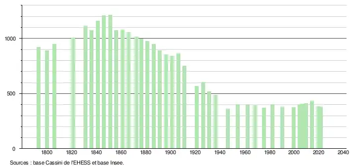 L'évolution du nombre d'habitants est connue à travers les recensements de la population effectués dans la commune depuis 1793. Pour les communes de moins de 10 000 habitants, une enquête de recensement portant sur toute la population est réalisée tous les cinq ans, les populations légales des années intermédiaires étant quant à elles estimées par interpolation ou extrapolation[15]. Pour la commune, le premier recensement exhaustif entrant dans le cadre du nouveau dispositif a été réalisé en 2004[16].