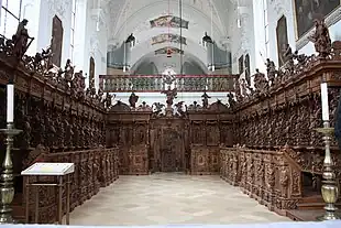 Restauration. Une première étape, de 1981 à 1986, consiste à décaper précautionneusement les boiseries pour supprimer le vernis noir qui les recouvrait intégralement. Puis les travaux doivent être suspendus en raison de la restauration de l’église. Dès 1992 débute la reconstruction sur place de ce chef-d’œuvre de mobilier baroque, opération pour laquelle on ne dispose que des photos des années 1880. Il faut en outre reconstituer plus de parties que ce que l’on avait initialement prévu. Par exemple, de 25 pupitres, seuls 21 avaient survécu. Les stalles restaurées ont été bénies le .