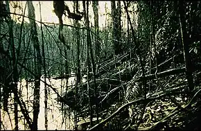 Par contre un milieu nouveau pour la région (mais peu présent sur le site de Saint-Eugène) est apparu dans la région centrale de la retenue de Petit-Saut (détectés à partir de quand le niveau de l'eau (devenue eutrophe) y a atteint 31 m) et près de l'embouchure de la crique Bonne Nouvelle[13], il s'agit de « radeaux flottants » d'herbacées (Ptéridophytes, Cypéracées, Poacées et d'hydrophytes, souvent des espèces pionnières typiques des savanes de Guyane) croissants en plein-soleil sur du bois-mort assez peu dense pour flotter. Certains de ces radeaux s'étalaient sur des centaines de mètres carrés. Ils perdurent quelques années avant de couler et constituent à eux seul un écosystème méritant d'être mieux étudié, notamment pour son interface subaquatique. Ce milieu a fait l'objet d'une étude publiée par Gérard Blake, de l'université de Savoie (publication 1997)[12]. Ces radeaux sont colonisés par quelques espèces animales, volantes (libellules) ou connues comme espèces pionnières ; Parmi les Odonates figurent des Calopterygidae, Coenagrionidae et Libellulidae). La fourmi Dacetones amigerum y a été observée, ainsi que des chenilles de Saturnidés, des Diptères (Muscidae, Chironomidae, Limoniidae) des iules et diverses arachnides. Sous l'eau ils sont couverts d'un biofilm riche en bactéries et microorganismes (périphyton). On sait depuis longtemps que de tels radeaux augmentent généralement la biodiversité (et contribuent parfois au déplacements dans l'espace de propagules et de biocénoses complètes)[14].