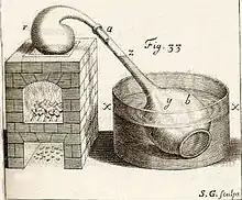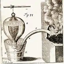 L'appareil de la figure 33 est conçu pour mesurer la quantité de gaz qui est produit par un corps « distillé »[n 1]. On dispose la substance à étudier dans une petite cornue r (une retorte), débouchant sur un récipient à long col (un matras) de grande capacité et percé au fond. Lorsqu’on enfonce ce dernier dans une cuvette d’eau x, l’eau entre en force dans le matras jusqu’à z. On redresse le matras et on l'ajuste à la cornue. La variation du niveau de l’eau dans le matras montre quelle quantité d’air est produite ou consommée lors de la distillation.