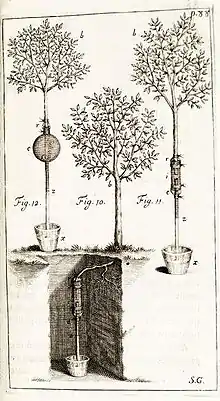Dans l'expérience 22 (fig. 11), la branche coupée en i, trempe dans l’eau d’un tube de verre renversé au-dessus d’une cuve x de mercure et eau. Elle « montre la grande force avec laquelle les branches tirent l’eau » .