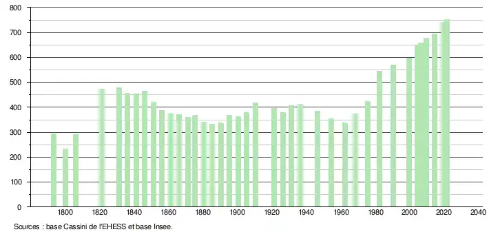 L'évolution du nombre d'habitants est connue à travers les recensements de la population effectués dans la commune depuis 1793. Pour les communes de moins de 10 000 habitants, une enquête de recensement portant sur toute la population est réalisée tous les cinq ans, les populations légales des années intermédiaires étant quant à elles estimées par interpolation ou extrapolation[19]. Pour la commune, le premier recensement exhaustif entrant dans le cadre du nouveau dispositif a été réalisé en 2004[20].