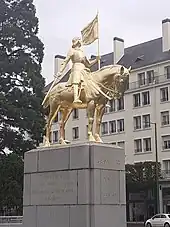 La représentation en armure, sur un cheval, épée à la main, comme guidant le peuple français, est classique dans l'iconographie de Jeanne d'Arc[62].