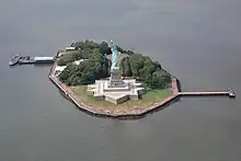 La statue est située sur l'île de Liberty Island, dans le port de New York. À l'origine, l'île était connue sous le nom de Bedloe's Island, et servait de base militaire. Elle abritait le Fort Wood construit en granite et dont les fondations en forme d'étoile à onze branches servirent de base pour la construction du socle de la statue. Le tracé géométrique de ce fort a imposé l'orientation de la statue, qui est tournée vers le sud-est dans l'axe de l'un des principaux bastions du fort, face à l'Océan et à l'Europe[72].