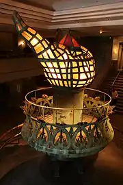 La flamme actuelle reprend le modèle original de Bartholdi alors que depuis l'inauguration elle avait été remplacée par un phare, qui n'a d'ailleurs pas fonctionné longtemps (1886-1891). Le flambeau a été entièrement restauré et la flamme en métal recouverte de feuilles d'or, éclairée par des lampes placées sur le balcon qui l'entoure. En 1985, pour rénover le flambeau de la statue, les États-Unis, à l'initiative de Jacques Graindorge directeur de l'artisanat français et de sa chargée de mission pour les métiers d'art Catherine de Logères, ont fait appel à une entreprise de Bezannes, près de Reims, où travaillent des artisans experts en ferronnerie d'art : les Métalliers champenois. La dorure de la flamme a été réalisée par une autre entreprise rémoise, les Ateliers Gohard. L'ancienne torche est aujourd'hui exposée dans le musée érigé à la pointe nord de l’île (ouvert en 2019).