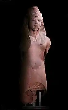 En quartzite rose, un matériau noble, le travail est de grande qualité. Le pharaon est coiffé du pschent posé sur le némès, l'uræus sur le front. Avec un large collier pectoral sur la poitrine, il est vêtu du pagne shendyt. Une dague à poignée en forme de faucon est passée à sa ceinture où un cartouche porte le nom du pharaon. La hauteur originelle des statues avoisinait les six mètres, une particularité est la présence de peinture bleue et noire encore visible au niveau du visage et de la coiffe.