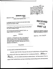 Le , la juge Barbara Jaffe de la Cour suprême de l'État de New York ordonne une ordonnance d'habeas corpus à deux chimpanzés captifs[9] mais le lendemain, le jugement est modifié pour supprimer les mots "ordonnance d'habeas corpus"[10],[11],[12].