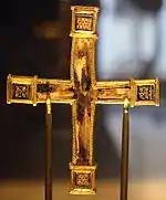 Staurothèque de Nicéphore II Phocas (963-969). Ivoire de l'art de la dynastie macédonienne de Byzance dite du groupe Nicéphore. Le recto porte une croix cantonnée de quatre saints sculptés en pieds (la Mère de Dieu, Jean-Baptiste, saint Stéphane (aussi dit "Etienne"), Jean l'Évangéliste) et limitée en haut et en bas par deux bandeaux sculptés ornés de six médaillons contenant le Christ (Pantocrator) flanqué des archanges Michel et Gabriel, et Constantin flanqué d'Hélène et de Longin. Le verso porte deux inscriptions, la première occupe le centre de la plaque et est tracée en forme de croix, la seconde court tout autour de la plaque et est abîmée par endroits par les trous de clous de fixation. La hauteur des lettres est de 6 à 11 mm[8]. Église San-Francesco, Cortone (Calabre, Italie).