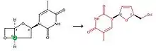 La stavudine ou D4T fut synthétisée pour la première fois par le scientifique américain Jerome Horwitz dans les années 1960 par rupture de la liaison entre le carbone entouré en vert et l'oxygène. L'alcool primaire correspondant, la stavudine, est ainsi formée.