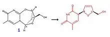 La molécule de formule brute C10H12N2O4 (correspondant au composé numéro 1) est un exemple de molécule pouvant servir à synthétiser du D4T en passant par un réarrangement structural. Cette molécule est d'abord mise en présence d'un sel d'imidazolium (à 50 °C), puis réagit avec NaH dans des conditions particulières (température de 100 °C, pendant 5 min), et forme ainsi la stavudine.
